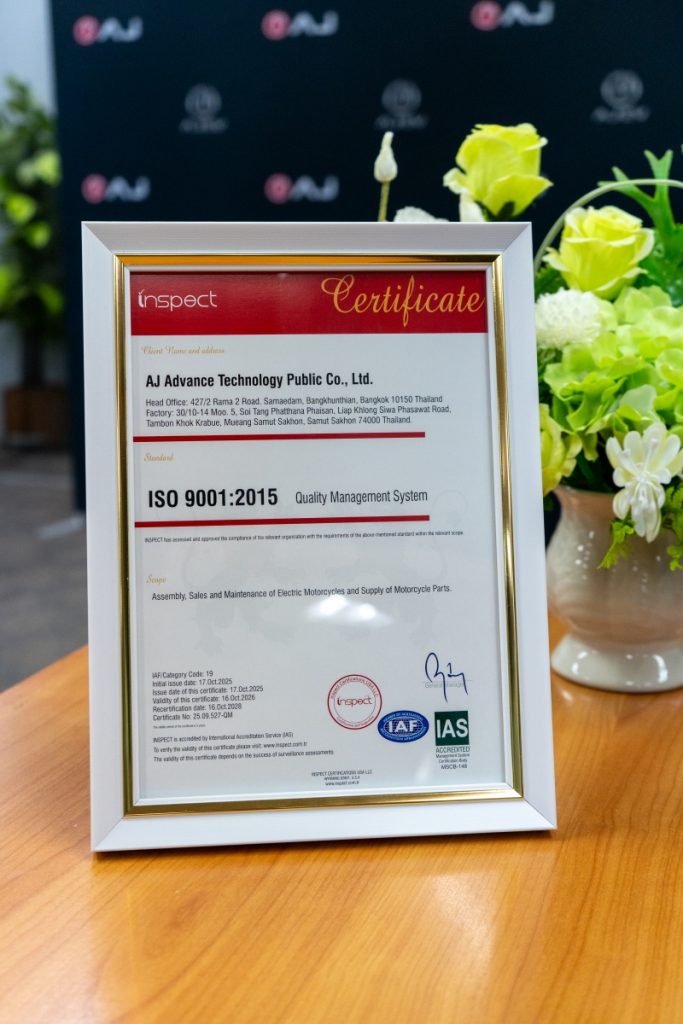 การได้รับมาตรฐาน ISO 9001:2015 ครั้งนี้ ถือเป็นอีกก้าวสำคัญของบริษัทฯ ในการยกระดับคุณภาพการผลิตและบริการ โดยเฉพาะกลุ่มผลิตภัณฑ์ รถจักรยานยนต์ไฟฟ้าแบรนด์ AJ EV ที่กำลังได้รับความนิยมเพิ่มขึ้นอย่างต่อเนื่อง ทั้งด้านความคุ้มค่า ประสิทธิภาพ และการดูแลหลังการขาย